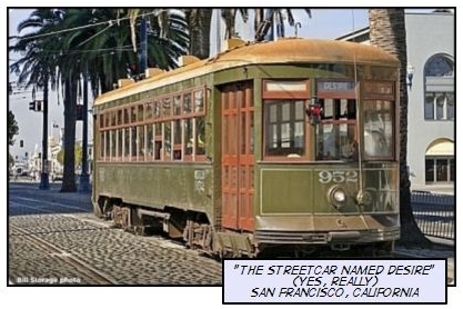 The problem with Napa's Downtown Trolley isn't that a trolley is not a good idea. It's that Napa doesn't actually have a trolley. Napa's trolley isn't a trolley, it's a bus. Trolleys go on rails, not on rubber wheels. Transportation experts know that riders much prefer trolleys to buses. (For example, see this article.) People can ride phony trolleys in tourist towns all over the country. Big deal. What they actually like are real trolleys. Whatever you call them—trolleys, streetcars or trams—they're those things that run on rails but are not trains or rapid transit systems like BART. San Francisco, California